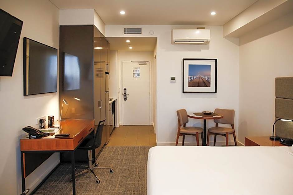 These well-appointed apartments offer natural light through a large window and provide an open-plan space to unwind and relax. Featured is apartment-controlled heating/air conditioning, a desk, LCD TV and high-speed WiFi. The kitchenette offers a cook top, toaster, kettle, microwave and full size fridge while the private bathroom includes Milk & Co amenities, a hair dryer and a laundry with a washing machine and dryer. A wardrobe, ironing facilities and private safety deposit box are also provided.